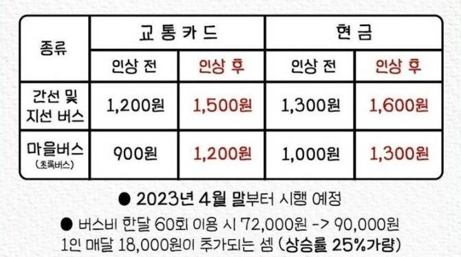 2023년 인상되는 요금 - 버스요금