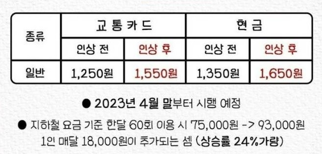 2023년 인상되는 요금 - 지하철요금