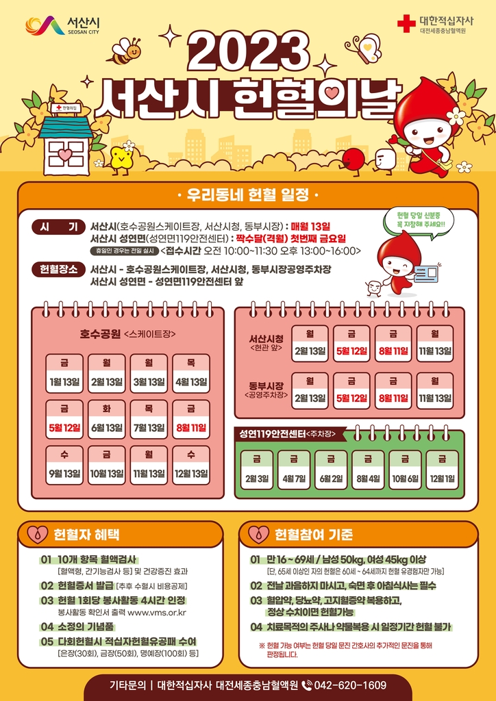 서산시는 매달 13일(주말은 금요일) 시내 호수공원에서 헌혈의 날을 운영합니다.